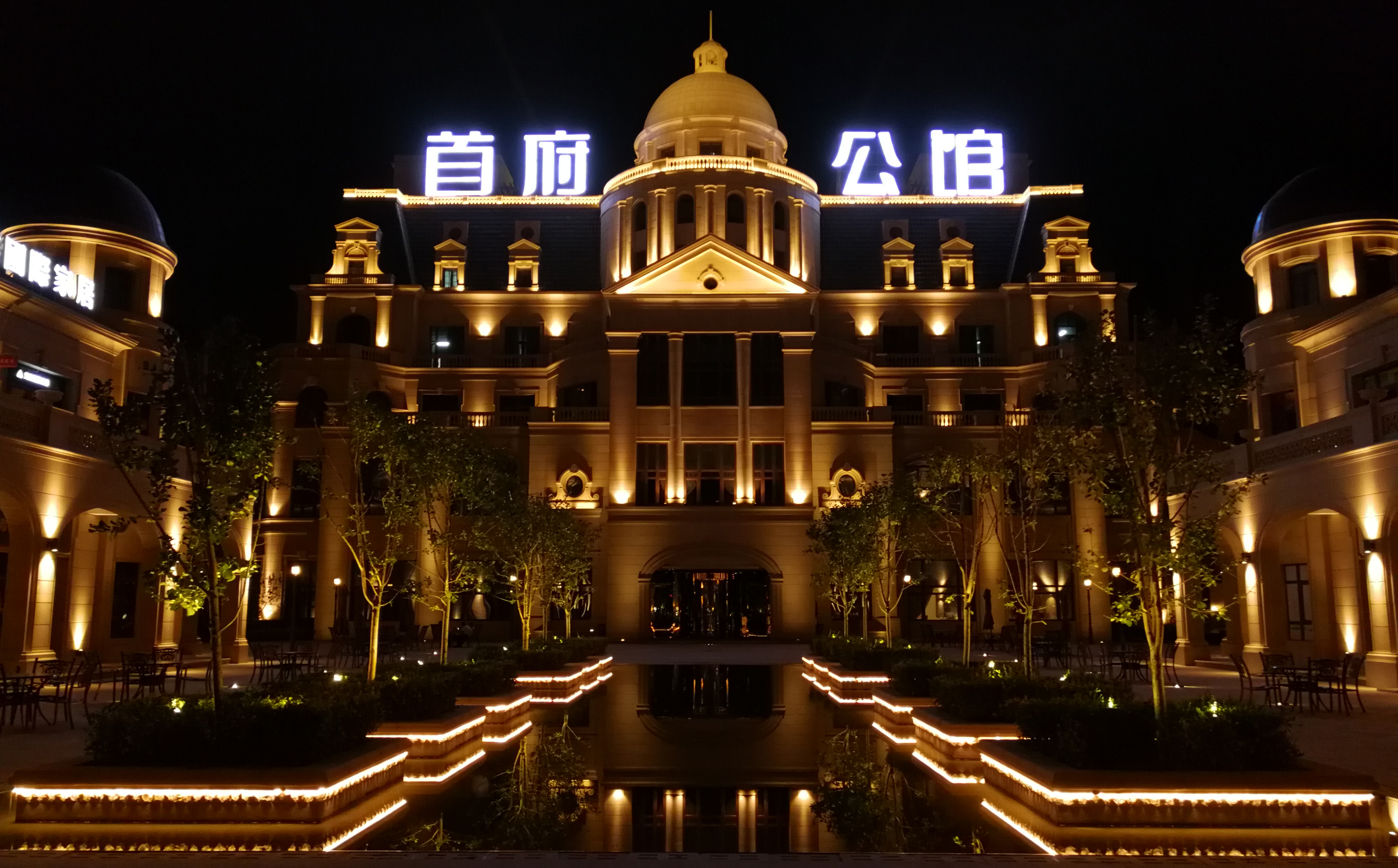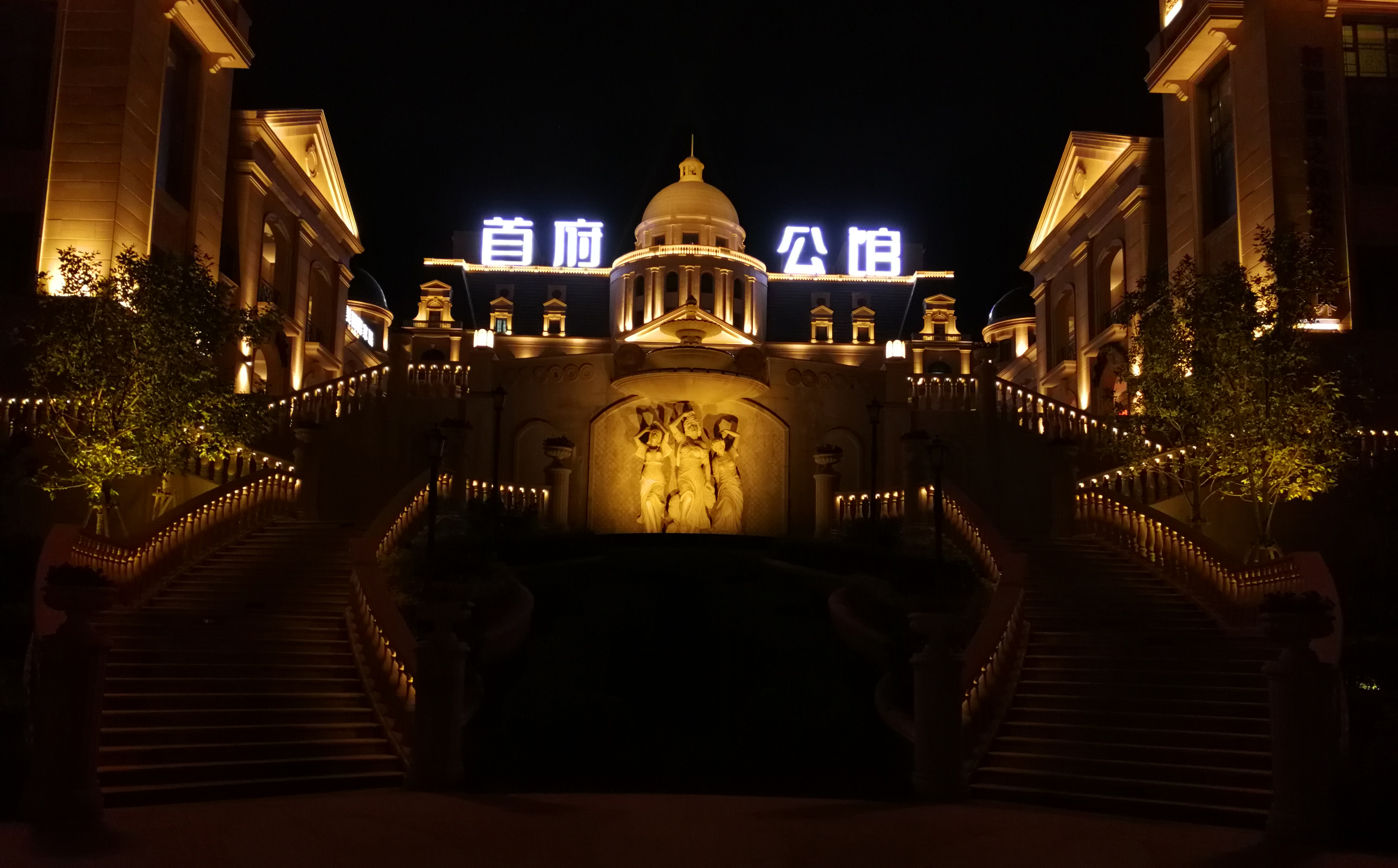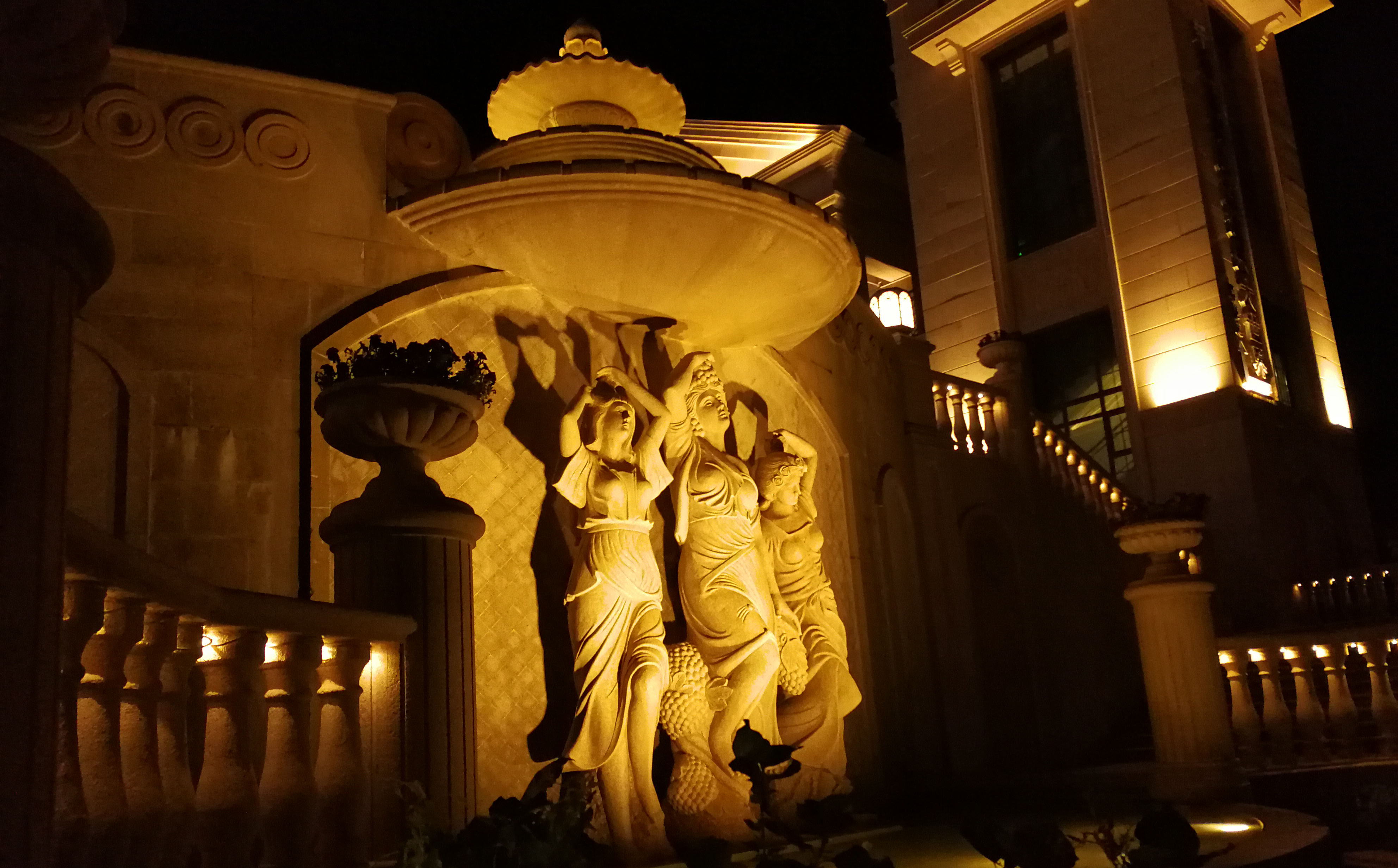 黄色的光与建筑融合,笔笔光束勾勒除了建筑的欧式气息。